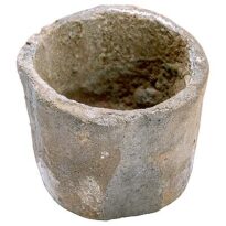 Cadinho entalhado em grafite, de forma cilíndrica, com resquícios de metal fundido no interior e no fundo exterior.