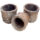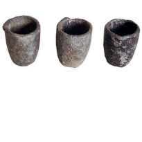 Conjunto de cadinhos entalhados em grafite, em formato cônico com um ligeiro bico na borda, com resquícios de metal fundido em suas superfícies.