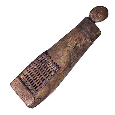 Caixa comprida de madeira, em formato semelhante a uma pata grossa de cavalo, com o corpo em tronco de cone. No terço inferior, na parte mais larga, há um chanfro lateral bem marcado. No lado oposto a esse chanfro existe um grande recorte retangular vazado, fechado por uma grade de ferro com vários pequenos aberturas retangulares. Na extremidade mais fina há uma boca fechada por uma tampa em forma de calota semiesférica. A parte interna dessa tampa é revestida com uma peça de borracha vulcanizada que funciona como dobradiça e vedação, e na parte de baixo há um ressalto circular que se encaixa na boca da caixa para mantê-la firme.
