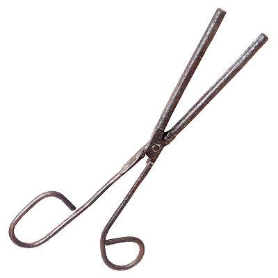 Ferramenta de ferro em forma de tesoura, formada por duas hastes que se cruzam em “X” no meio, unidas por uma articulação. Na parte da frente, antes dessa junção, uma das hastes tem a seção em meia-cana (meio cilindro, em forma de canal) e a outra é cilíndrica, de modo que uma se encaixa na outra. Na parte de trás da junção, repete-se o mesmo tipo de encaixe: uma haste em meia-cana e a outra cilíndrica. As partes finais dessas hastes são achatadas e terminam em argolas circulares, que funcionam como pegas para os dedos.