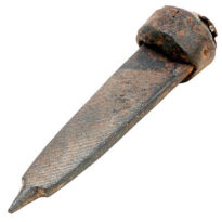 Lima pequena, com lâmina em formato triangular, achatada e com estrias diagonais. A ponta é bem fina. Na parte de trás, resta apenas um pedaço do cabo original, que está quebrado.