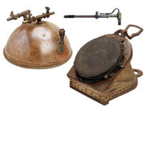 Compressor formado por um reservatório de cobre em forma de meia esfera, com um bico cilíndrico na parte inferior, na posição vertical, onde se encaixa a mangueira vinda do fole. Na parte de cima há uma tampa rosqueada. No topo, ao centro, há uma peça em “T”, cujas extremidades superiores terminam em dois bicos cilíndricos, cada um com sua válvula de regulagem. Um pouco ao lado há um segundo “T”: uma ponta termina em outro bico com válvula e a outra é fechada com um parafuso. Os bicos superiores são lisos, para encaixe das mangueiras que conduzem a mistura de ar e combustível até os maçaricos (soldadores). O conjunto inclui ainda um fole e um maçarico para operação.