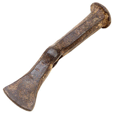 Ferramenta feita de aço, possui uma parte com formato quadrangular e bordas chanfradas, terminando em uma ponta arredondada e mais espessa, chamada de “praça”. A outra extremidade é formada por uma lâmina larga e achatada, com o final curvo e o gume arredondado, disposto perpendicularmente ao cabo. No centro há um orifício cilíndrico para o encaixe do cabo.