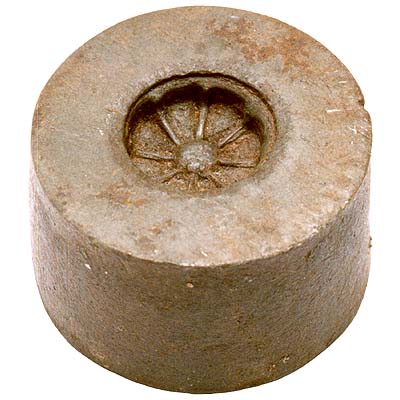 Molde em formato de cilindro de aço. Traz um desenho em baixo-relevo bem marcado representando uma flor.