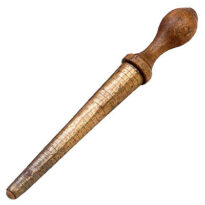Objeto em madeira, com haste em forma de cone, terminada em uma pequena esfera. A superfície dessa haste é revestida por um tubo de bronze amarelo, também cônico, marcado com frisos circulares e graduado com os números de "1" a "33". Abaixo do revestimento fica o cabo de madeira torneada, sem metal, com frisos decorativos nas partes da frente e de trás, servindo de empunhadura.